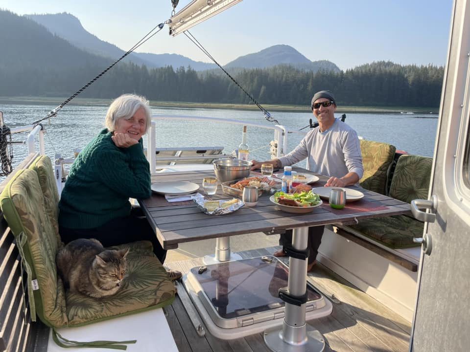 We’re eating hors d’oeuvres (homemade smoked salmon, grapes, apples, cheese and crackers) on deck after anchoring in our own private little cove 10 miles from Sitka, tomorow’s destination. After a short cruise the next morning we’ll spend the day exploring this small Alaska town where I’ll fly home from the following day.